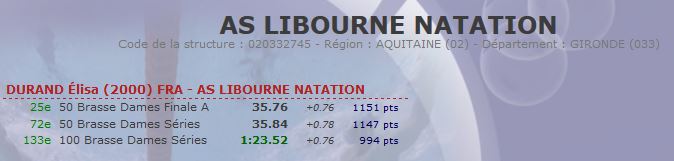 Comme vous avez pu le suivre sur la page « facebook » du club, Elisa a terminé 5éme sur le 50 brasse des championnats élite catégorie « comen »… Lire la suite »Championnats de France élite